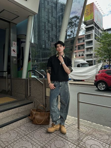 Một chiếc áo thun đen in graphic độc đáo ở lưng – logo ChaChing nhưng được biến tấu theo hiệu ứng loang – vừa basic vừa nổi bật. Kết hợp cùng jeans xanh form straight, điểm xuyết chi tiết thêu ở túi sau. Outfit giữ sự giản dị nhưng không hề nhàm chán. Minimal art – thích hợp cho những ai ưa sự tinh tế, không thích quá nhiều chi tiết nhưng vẫn muốn tạo dấu ấn.