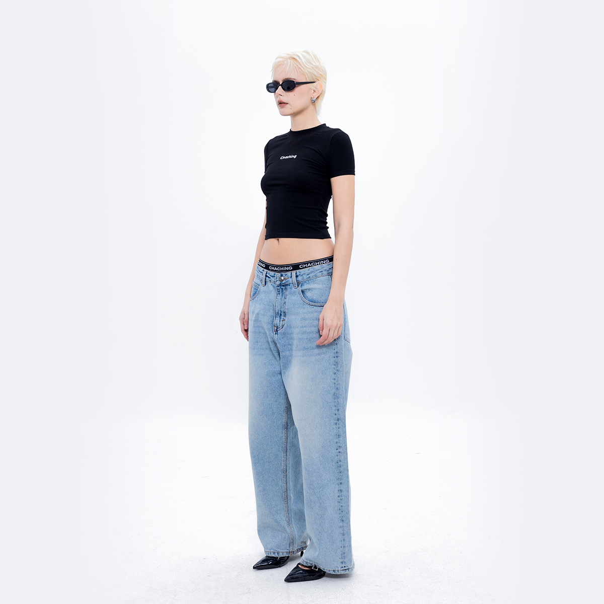 Thiết kế cổ tròn ôm nhẹ, tay ngắn, in logo CHACHING bằng lụa cơ bản ở ngực trái – tối giản nhưng không đơn điệu.