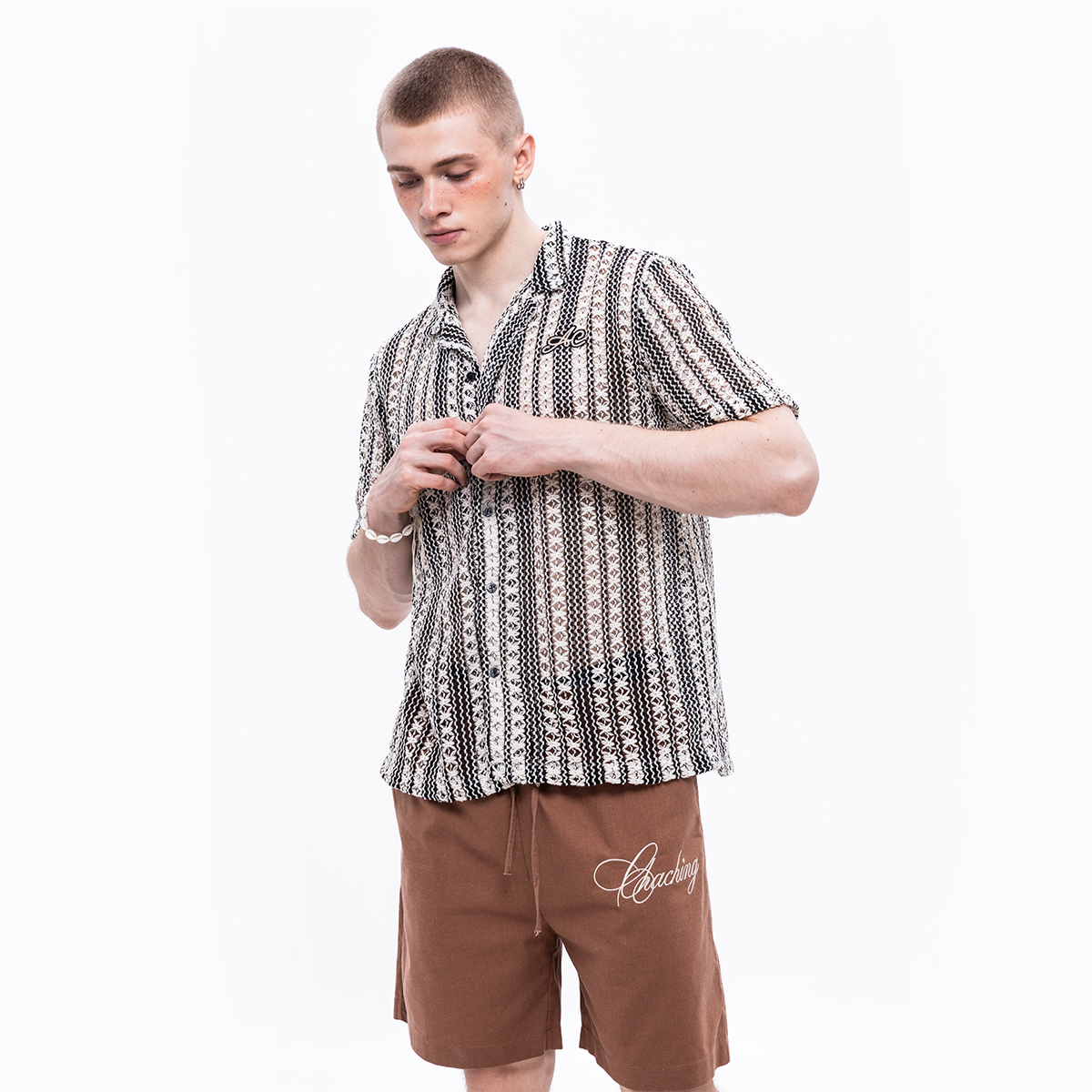 CHACHING GEOMETRIC SHIRT là thiết kế sơ mi tay ngắn theo phong cách Cuban cổ điển, được làm mới bằng chất liệu lưới cao cấp thoáng khí và họa tiết sọc trắng đen thời thượng.