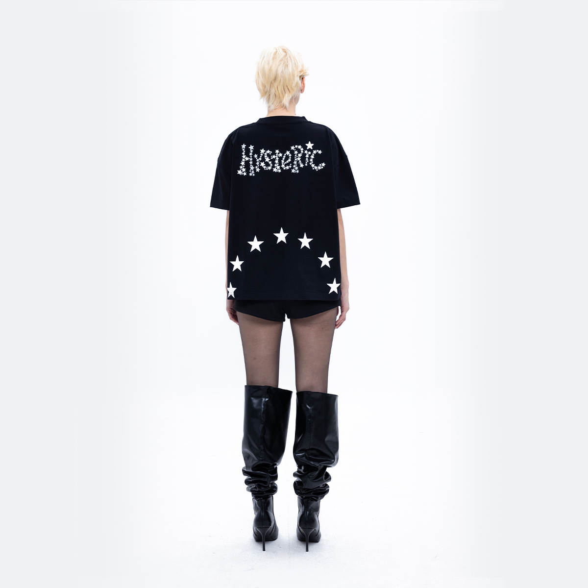 Phía sau là dòng chữ “HYSTERIC” in Foil bạc ánh kim nổi bật trên nền đen, kết hợp vòng sao lớn uốn cong bên dưới – tạo chiều sâu và điểm nhìn mạnh cho tổng thể thiết kế.