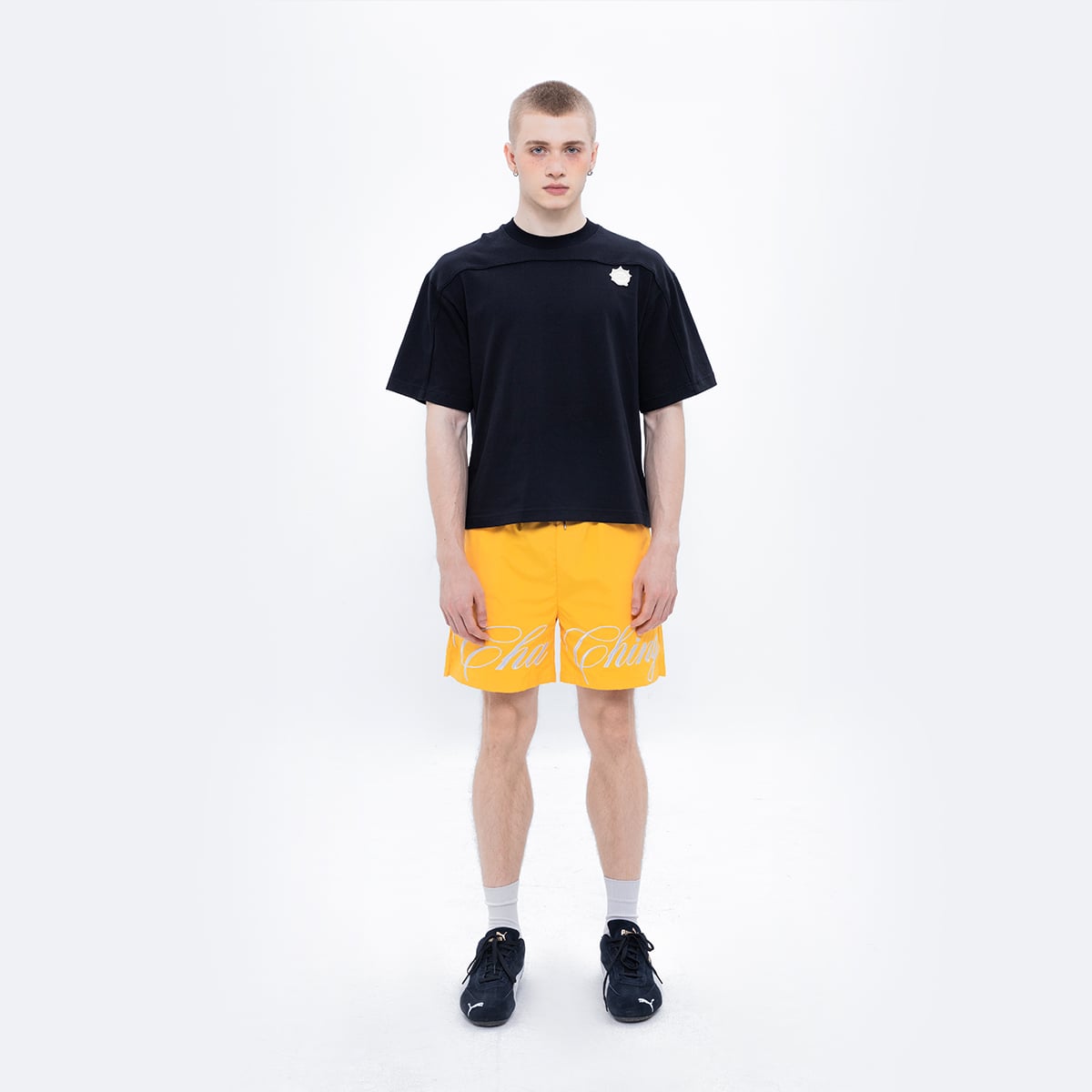 Mặt sau phối hình in lụa ngôi sao vàng kèm thêu chữ ChaChing — tạo chiều sâu cho outfit.
