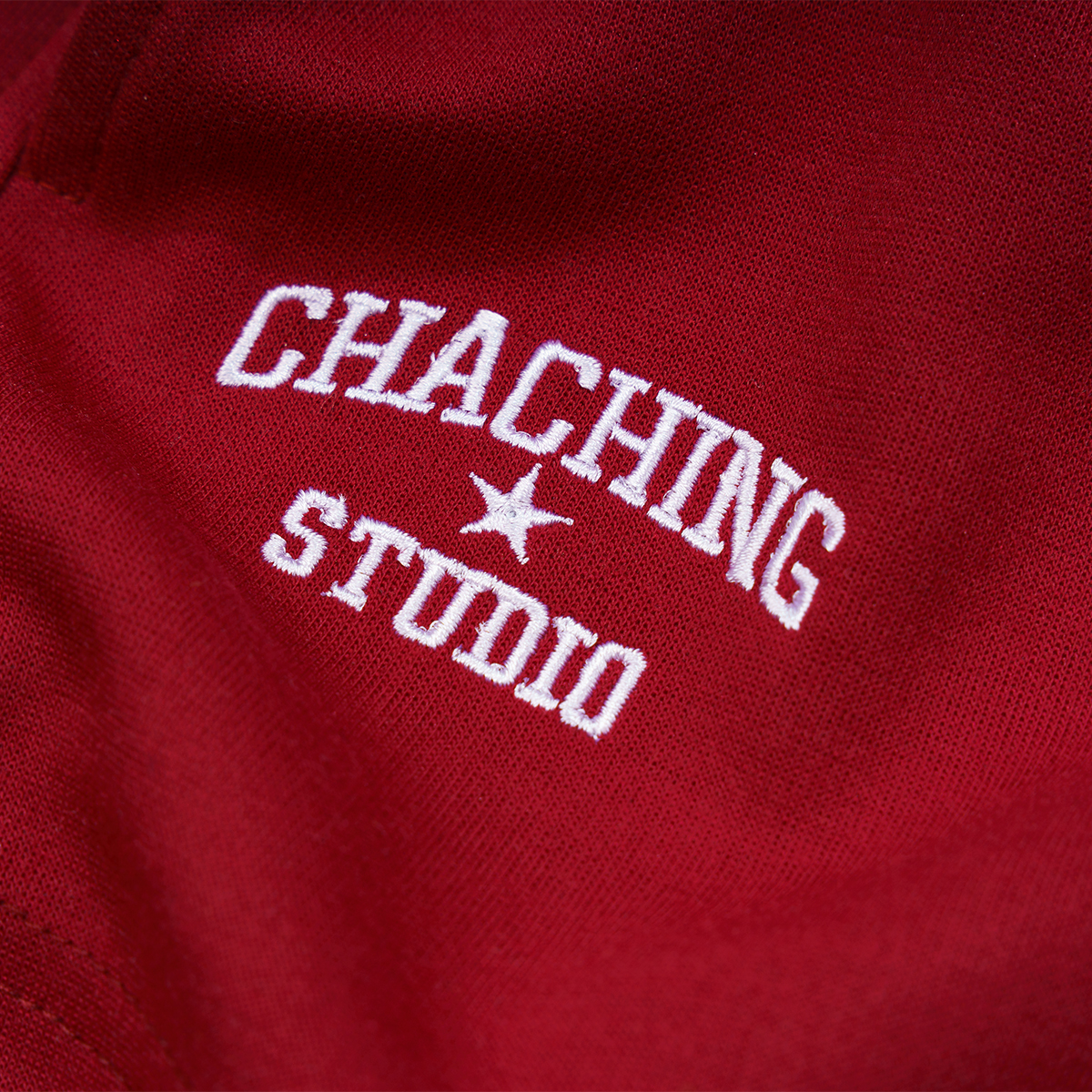 Hình thêu logo ChaChing ở lai quần