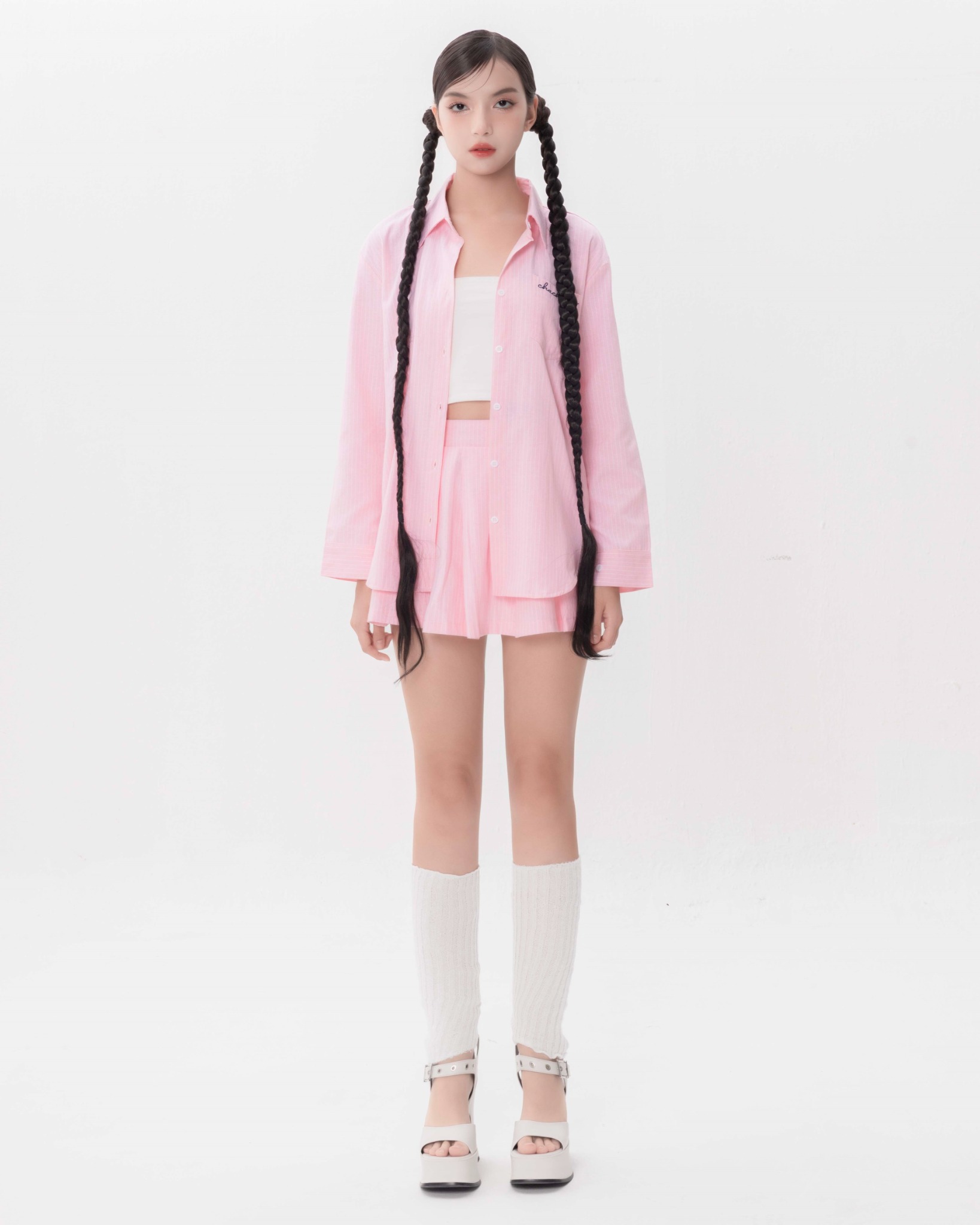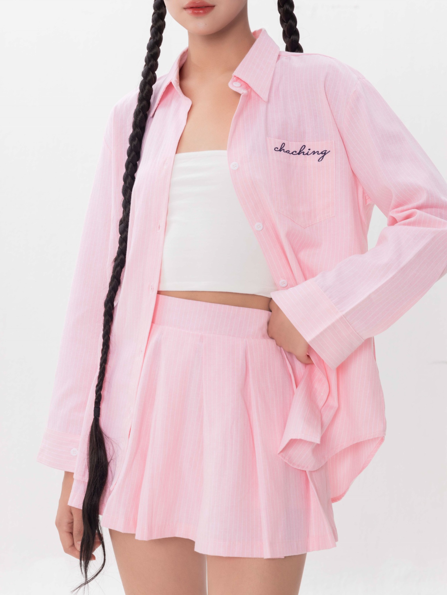 Áo được thiết kế phần tay dài, hoạ tiết Chaching được in thêu 3D tạo điểm nhấn cho tổng thể set váy.